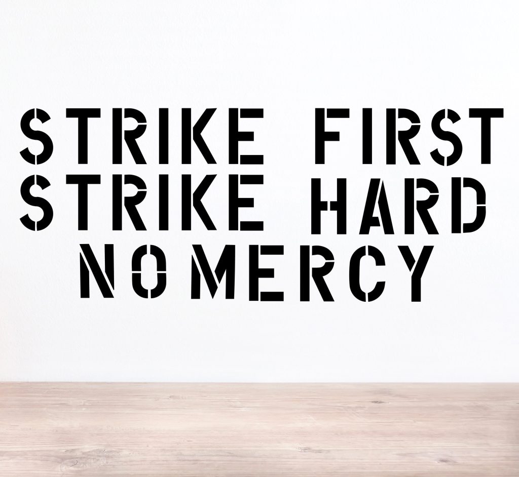 This is why the students of Cobra Kai, following the teachings of John Kreese and (in the first two seasons of Cobra Kai) Johnny Lawrence whose motto is Strike First, Strike Hard, No Mercy, become bullies and badly hurt other students.