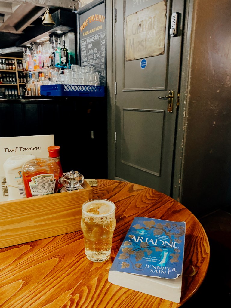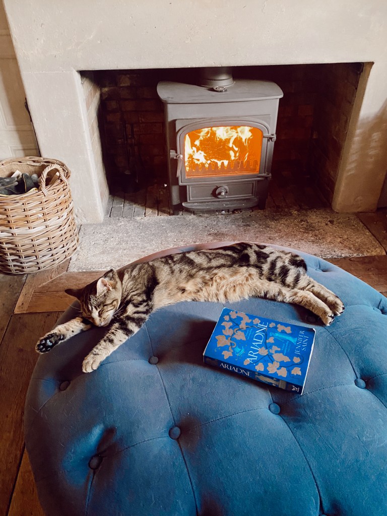And finally, here is a collage of all the beautiful places I read this book in. It includes: The Costwolds, Oxford, London (UK), Brugge (Belgium) and Ixtapa Zihuatanejo (México). That cute cat in the first picture is called Dolly and she is the most loving cat I’ve met. I miss her so much. She is in Bourton-on-the-Water, in a beautiful cottage that functions as an AirBnB, and she is probably lounging by the fire right now too. She loves that as you can see from the picture. She seemed to like Ariadne too. I read it to her out loud a few times and she jumped on my lap and purred, so I think that means she liked it.